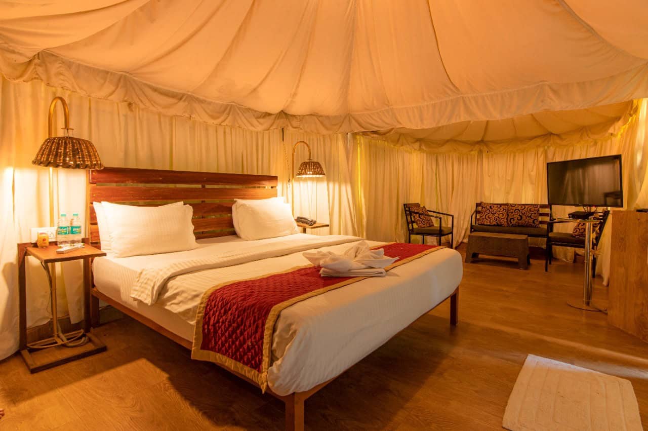 - The resort has a beautiful designed rooms and cottages, each providing an elegant and comfortable retreat. Guess What? this resort also has the Maharaja tent in their resort, which is so luxurious that you won’t want to miss.